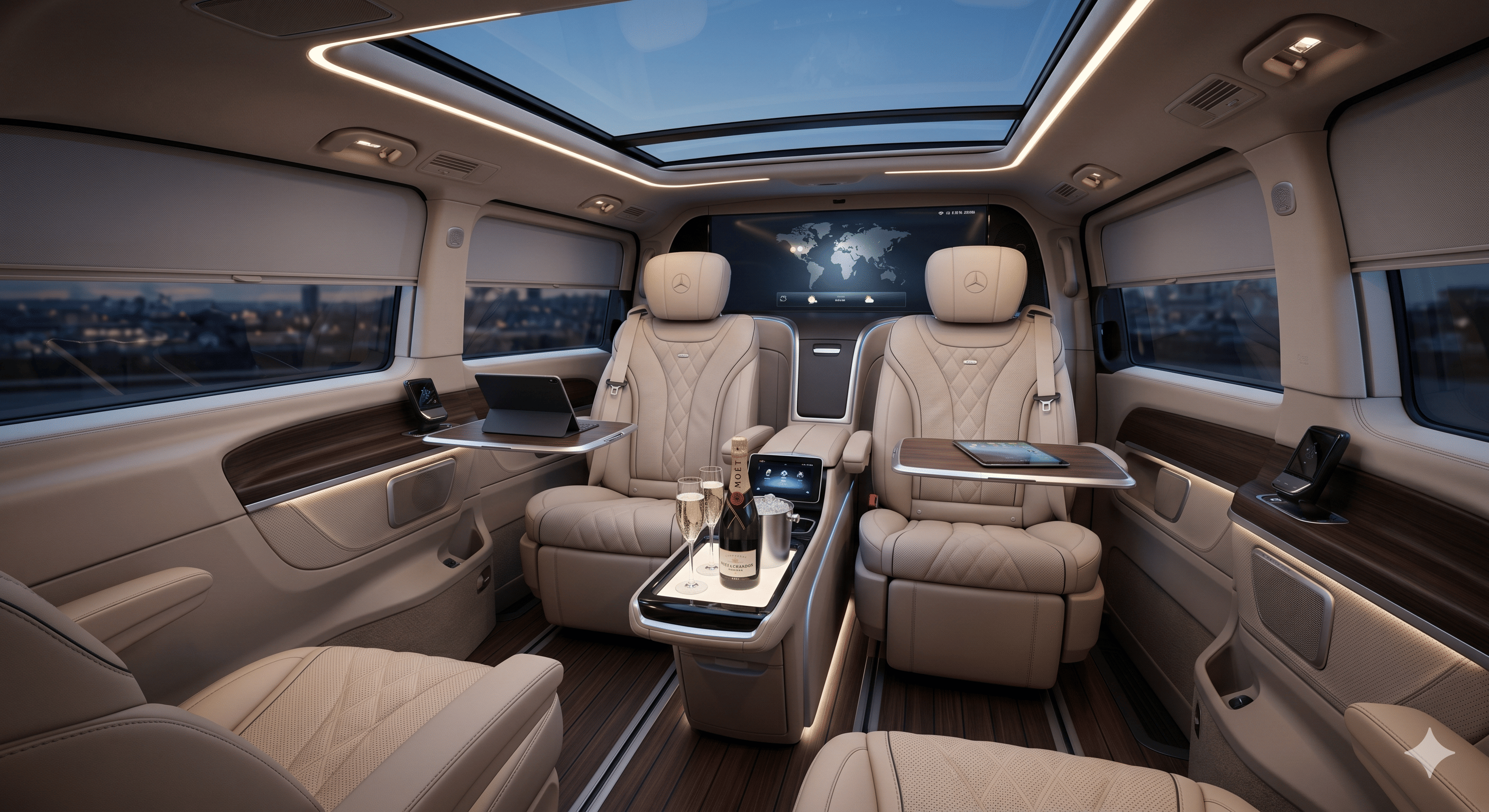 Uma frota de excelência inigualávelTemos orgulho de nossa frota meticulosamente mantida, com oMercedes-Benz Classe Vpara grupos premium e oMercedes-Benz Classe EouGênesis G80para viagens executivas individuais ou em pares. Cada veículo é escolhido por suas classificações superiores de segurança, interiores luxuosos e presença cinematográfica.