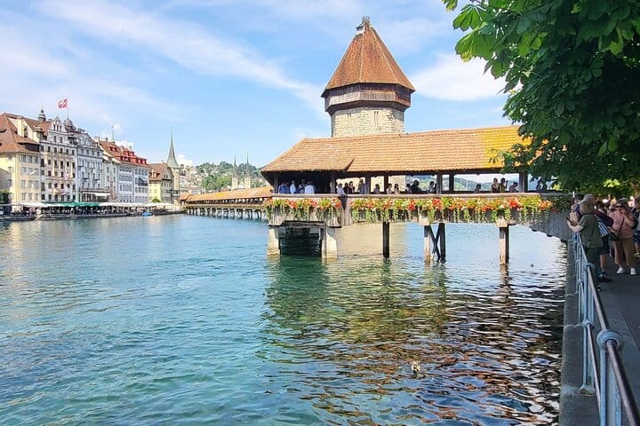 Walk across Lucerne’s most iconic landmark – a 14th-century covered wooden bridge adorned with historic paintings and a symbol of Swiss heritage.